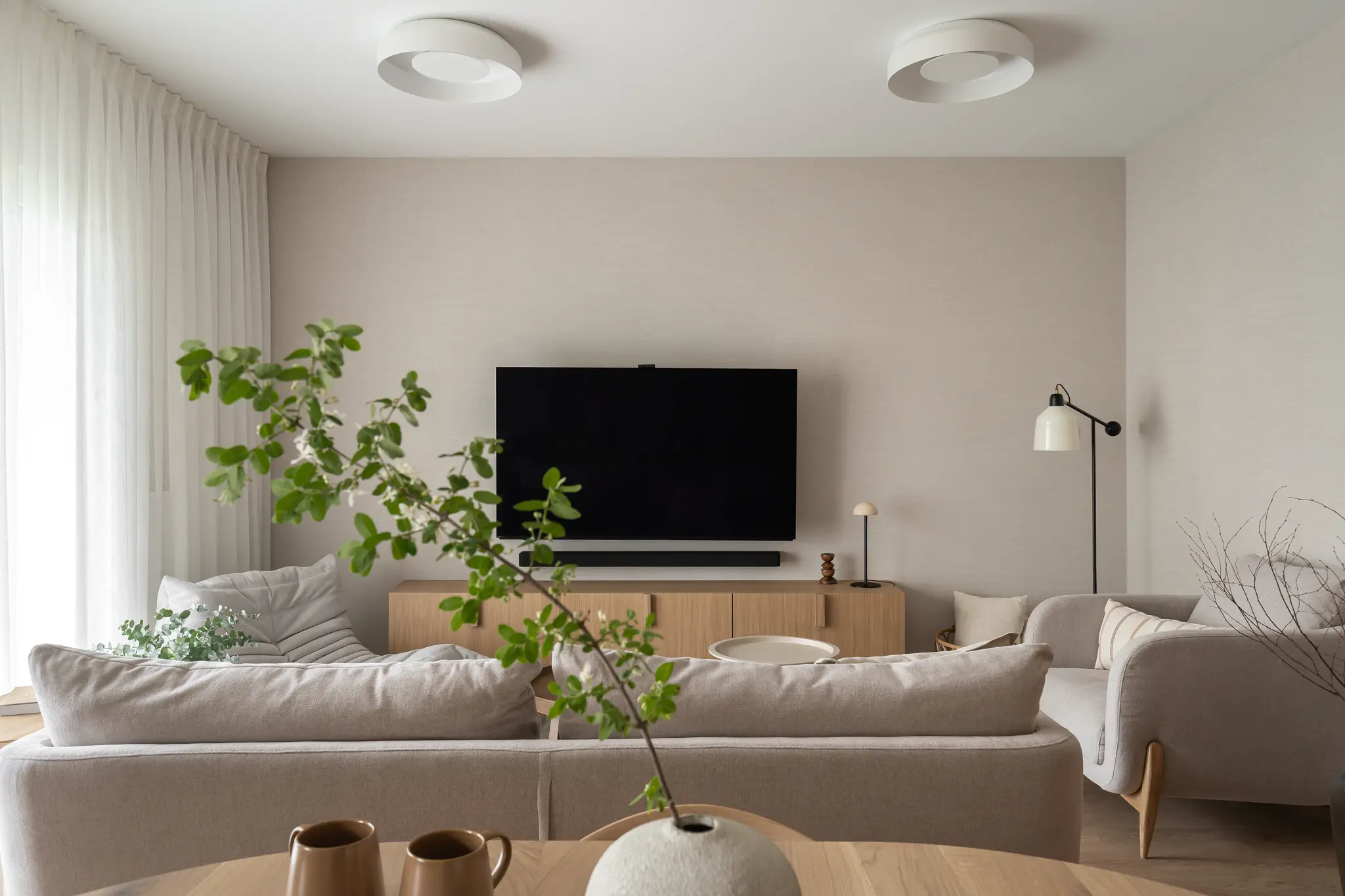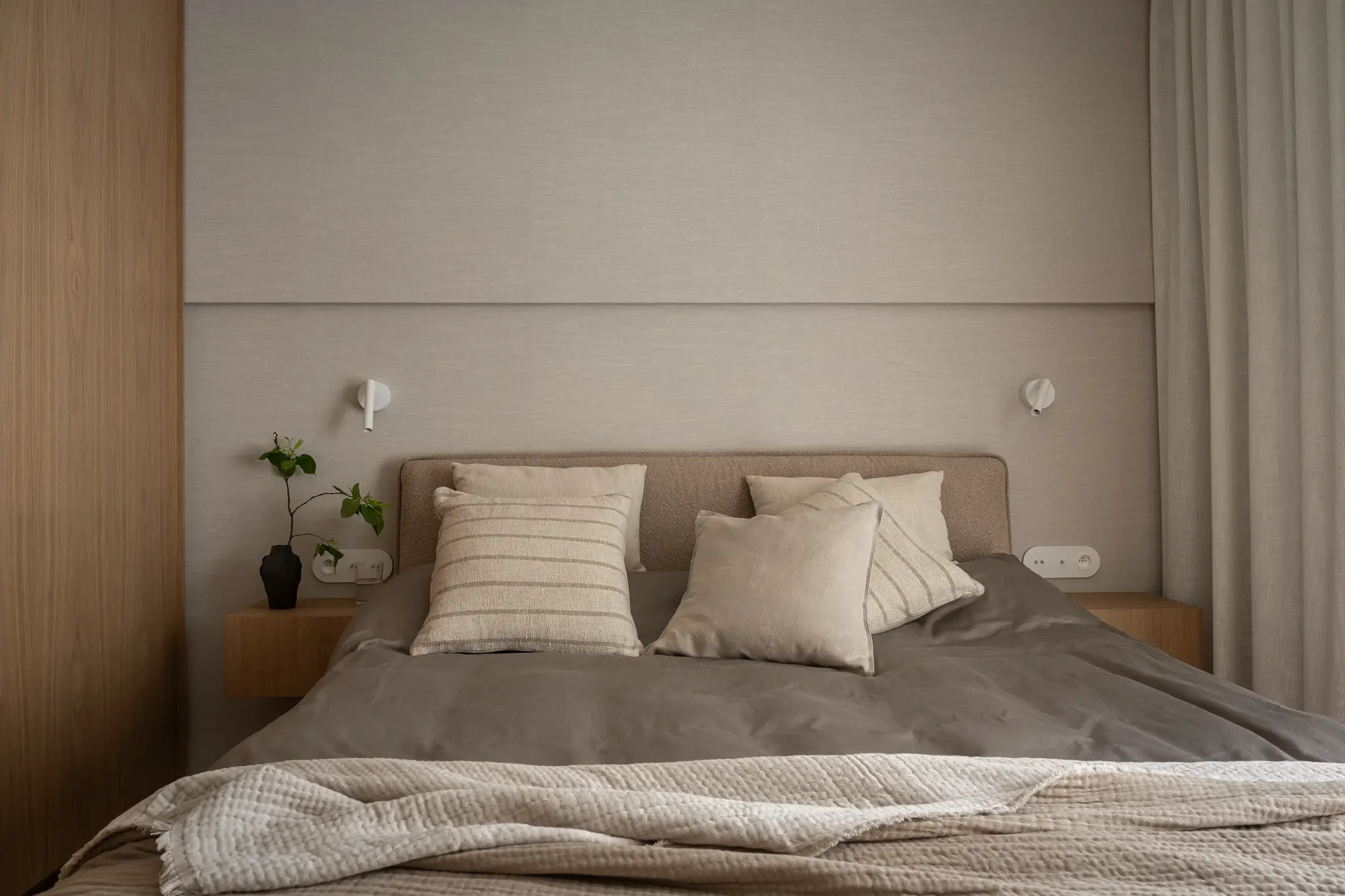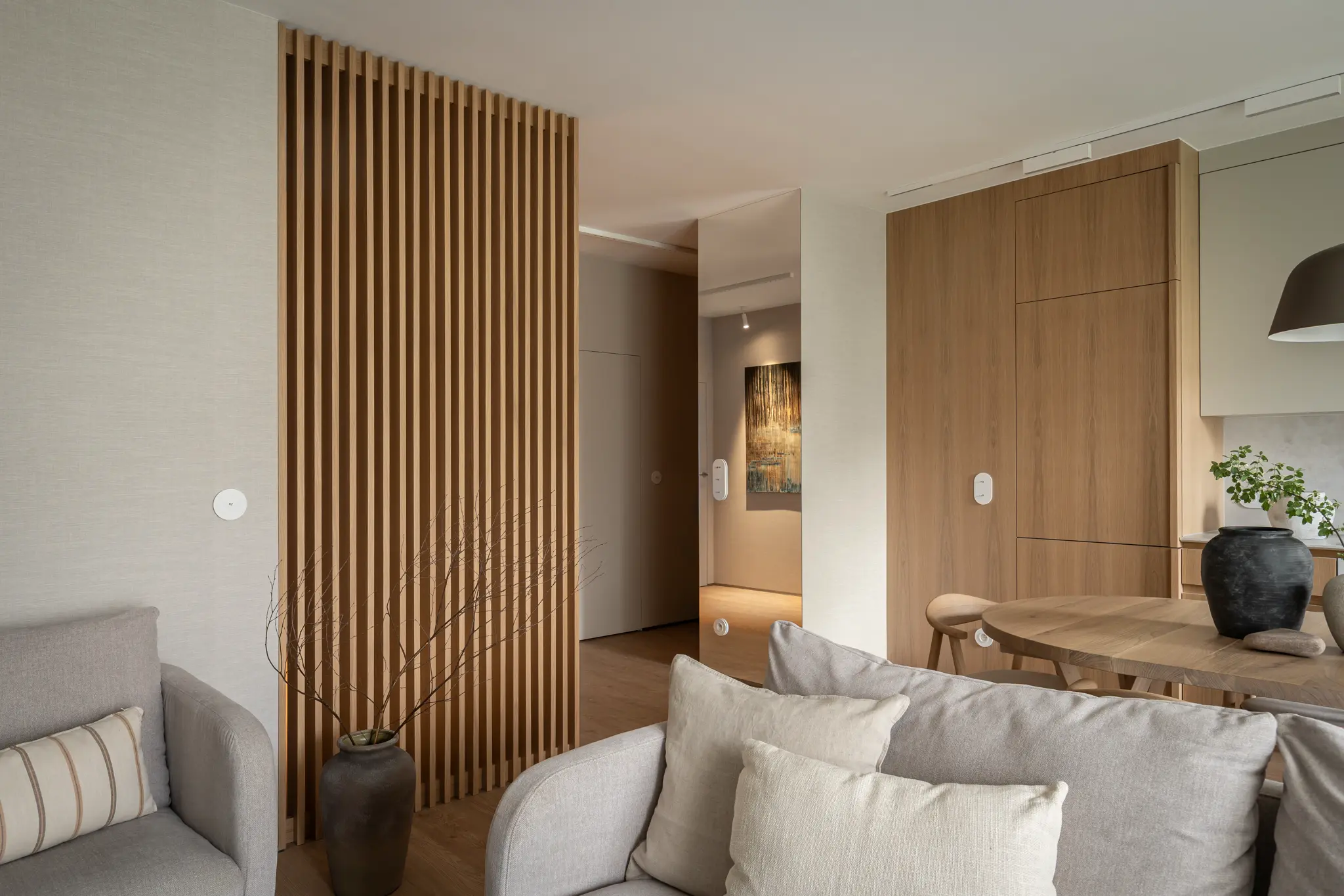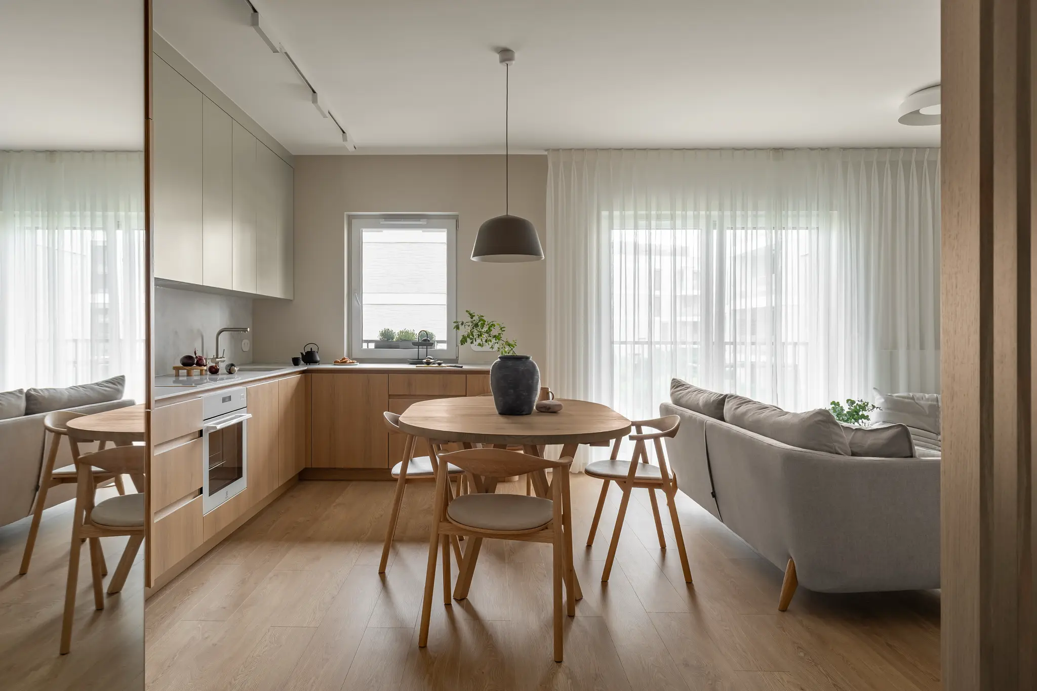 Zlokalizowane w zielonym sercu Bydgoszczy, tuż obok parku w Myślęcinku, to mieszkanie miało stać się dla jego właścicieli oazą spokoju i harmonii. Ich marzeniem było wnętrze, do którego wraca się po dniu pracy, by odnaleźć komfort i wyciszenie. Naszym zadaniem było przełożenie tego marzenia na język form, faktur i kolorów. Głównym bohaterem projektu uczyniliśmy drewno w starannie dobranym, pastelowym odcieniu, które w dialogu z neutralnym beżem stworzyło spójną i ciepłą bazę. Ściany otuliliśmy francuską tapetą o lnianej strukturze, dodając wnętrzu klasy i przytulności. W tak przygotowanej przestrzeni swoje miejsce znalazły ikony światowego wzornictwa, jak fotel Togo od Ligne Roset, oraz designerskie oświetlenie od polskich marek, które nadają całości indywidualny charakter. Sercem domu jest salon z kuchnią, subtelnie oddzielony od wejścia ażurową, drewnianą ścianką. Minimalistyczna zabudowa z dębowego forniru i blat z konglomeratu kwarcytowego podkreślają elegancję projektu. Ta estetyczna kontynuacja przenika do łazienki i sypialni, gdzie naturalne materiały i stonowana kolorystyka tworzą spójną opowieść o komforcie i prostocie.