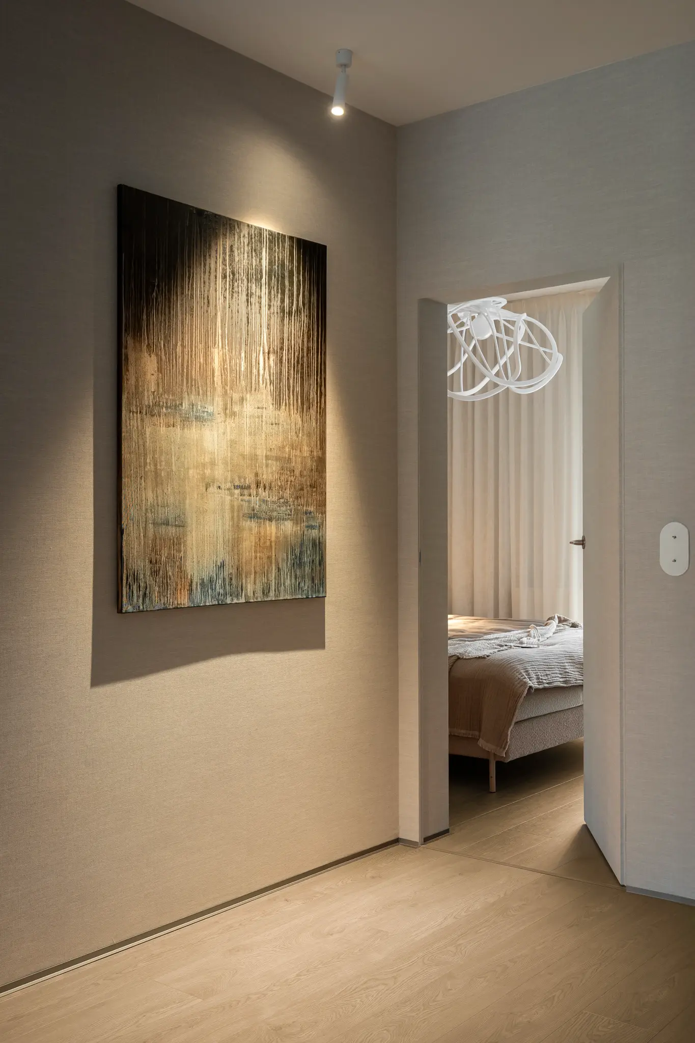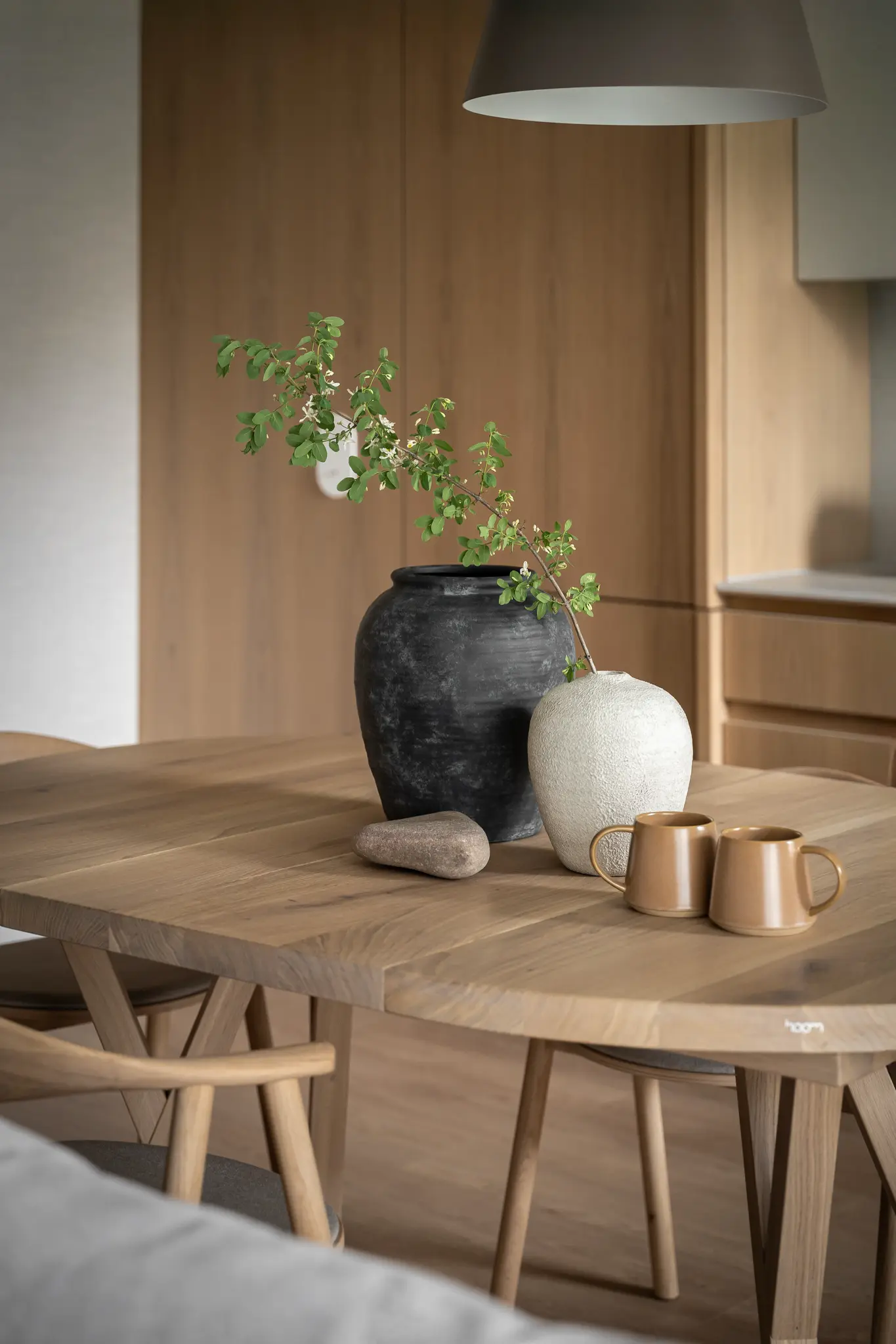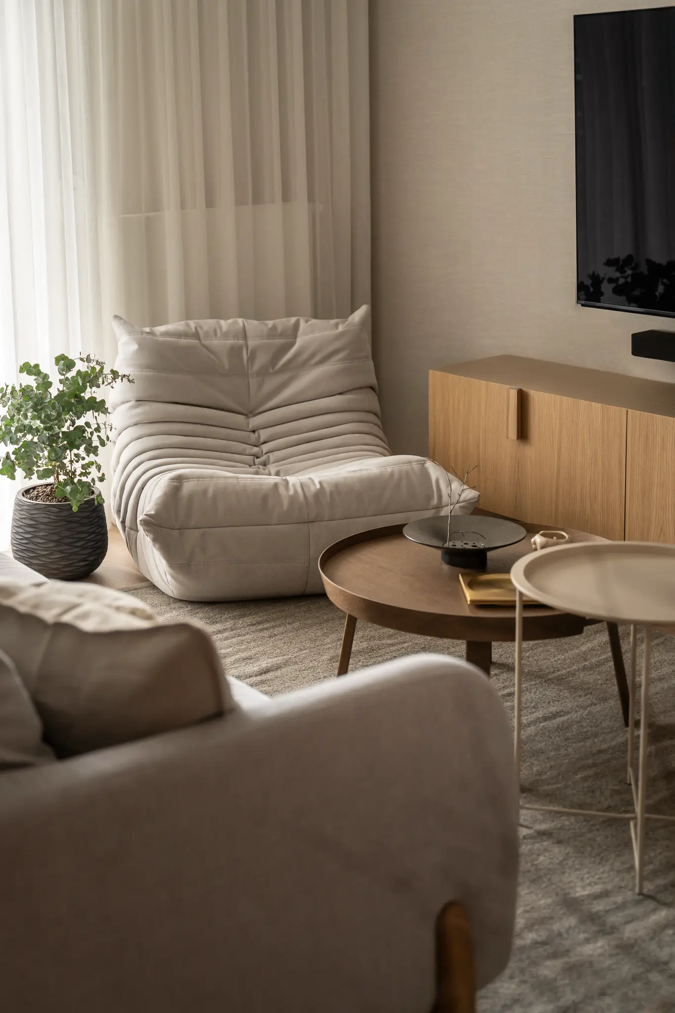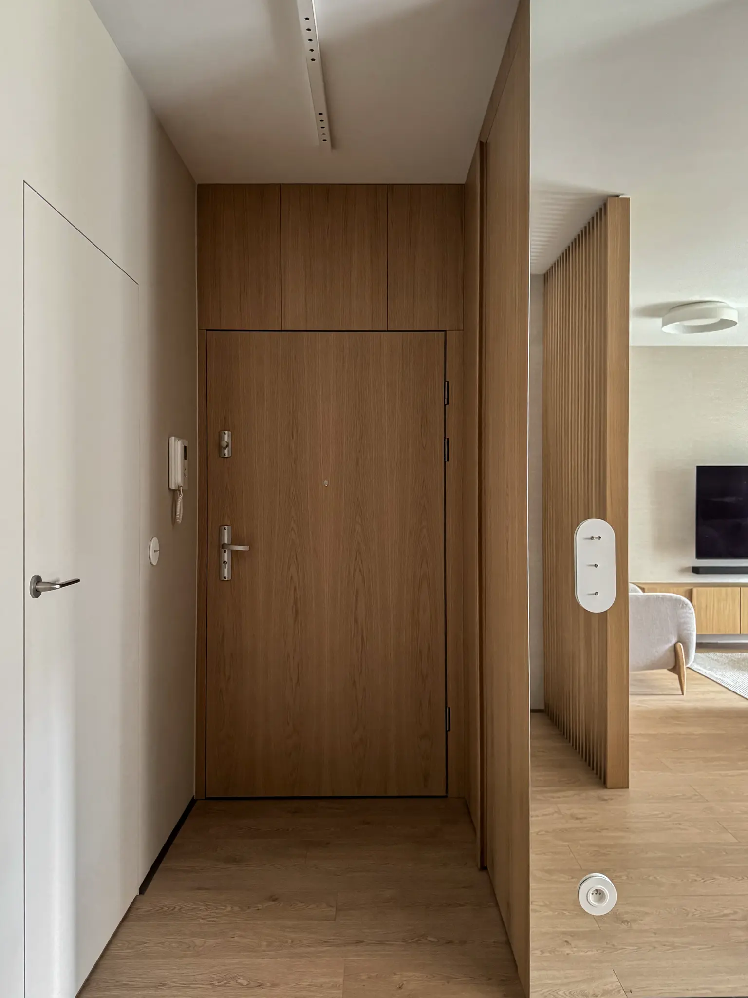 Zlokalizowane w zielonym sercu Bydgoszczy, tuż obok parku w Myślęcinku, to mieszkanie miało stać się dla jego właścicieli oazą spokoju i harmonii. Ich marzeniem było wnętrze, do którego wraca się po dniu pracy, by odnaleźć komfort i wyciszenie. Naszym zadaniem było przełożenie tego marzenia na język form, faktur i kolorów. Głównym bohaterem projektu uczyniliśmy drewno w starannie dobranym, pastelowym odcieniu, które w dialogu z neutralnym beżem stworzyło spójną i ciepłą bazę. Ściany otuliliśmy francuską tapetą o lnianej strukturze, dodając wnętrzu klasy i przytulności. W tak przygotowanej przestrzeni swoje miejsce znalazły ikony światowego wzornictwa, jak fotel Togo od Ligne Roset, oraz designerskie oświetlenie od polskich marek, które nadają całości indywidualny charakter. Sercem domu jest salon z kuchnią, subtelnie oddzielony od wejścia ażurową, drewnianą ścianką. Minimalistyczna zabudowa z dębowego forniru i blat z konglomeratu kwarcytowego podkreślają elegancję projektu. Ta estetyczna kontynuacja przenika do łazienki i sypialni, gdzie naturalne materiały i stonowana kolorystyka tworzą spójną opowieść o komforcie i prostocie.