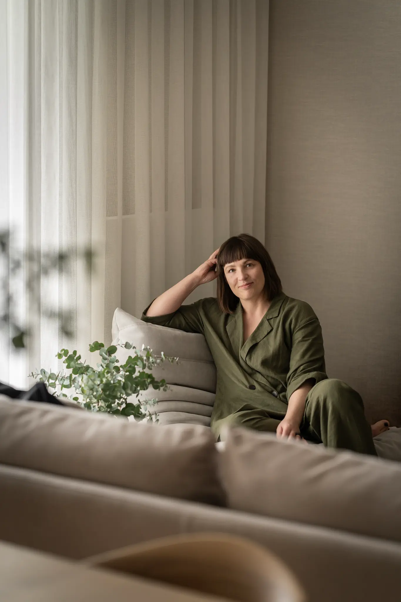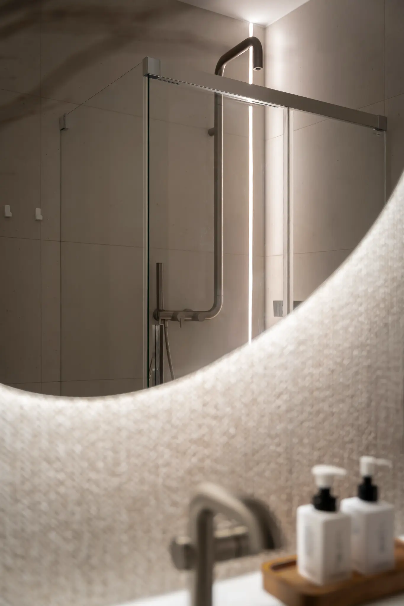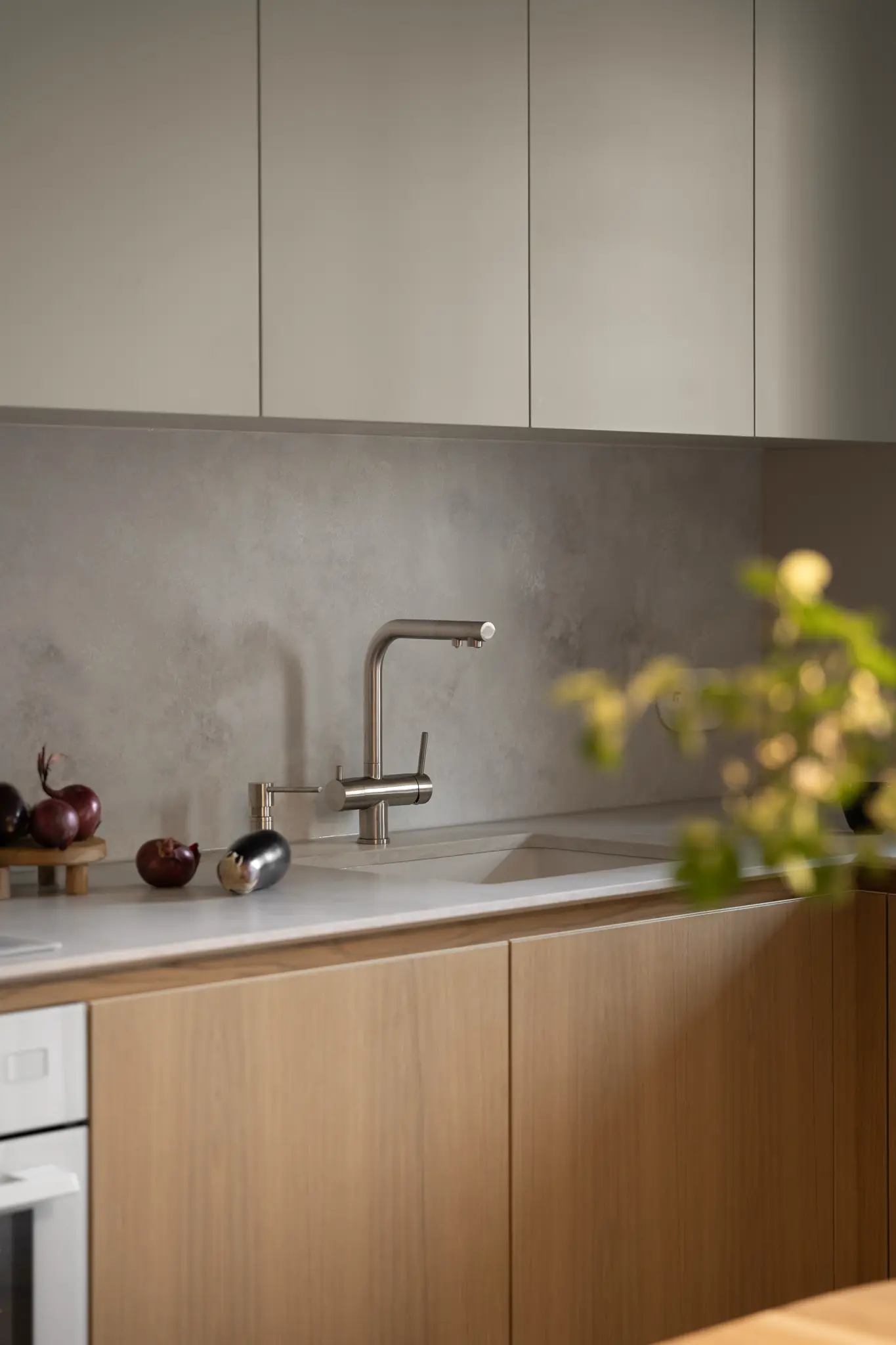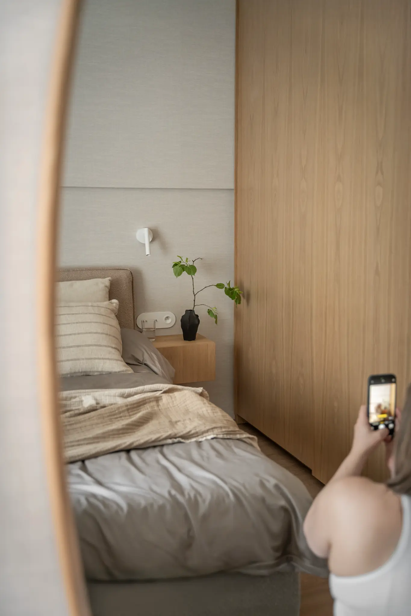 Zlokalizowane w zielonym sercu Bydgoszczy, tuż obok parku w Myślęcinku, to mieszkanie miało stać się dla jego właścicieli oazą spokoju i harmonii. Ich marzeniem było wnętrze, do którego wraca się po dniu pracy, by odnaleźć komfort i wyciszenie. Naszym zadaniem było przełożenie tego marzenia na język form, faktur i kolorów. Głównym bohaterem projektu uczyniliśmy drewno w starannie dobranym, pastelowym odcieniu, które w dialogu z neutralnym beżem stworzyło spójną i ciepłą bazę. Ściany otuliliśmy francuską tapetą o lnianej strukturze, dodając wnętrzu klasy i przytulności. W tak przygotowanej przestrzeni swoje miejsce znalazły ikony światowego wzornictwa, jak fotel Togo od Ligne Roset, oraz designerskie oświetlenie od polskich marek, które nadają całości indywidualny charakter. Sercem domu jest salon z kuchnią, subtelnie oddzielony od wejścia ażurową, drewnianą ścianką. Minimalistyczna zabudowa z dębowego forniru i blat z konglomeratu kwarcytowego podkreślają elegancję projektu. Ta estetyczna kontynuacja przenika do łazienki i sypialni, gdzie naturalne materiały i stonowana kolorystyka tworzą spójną opowieść o komforcie i prostocie.