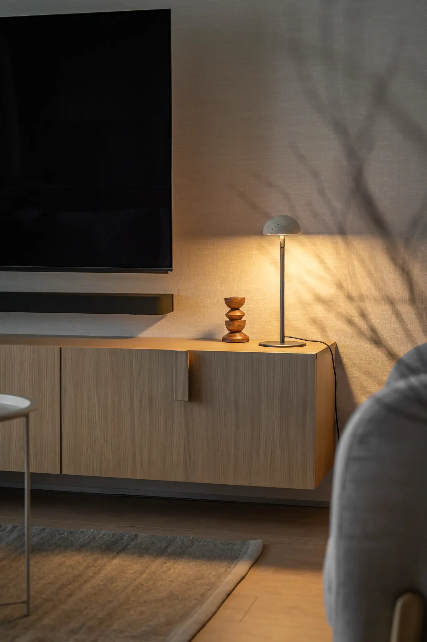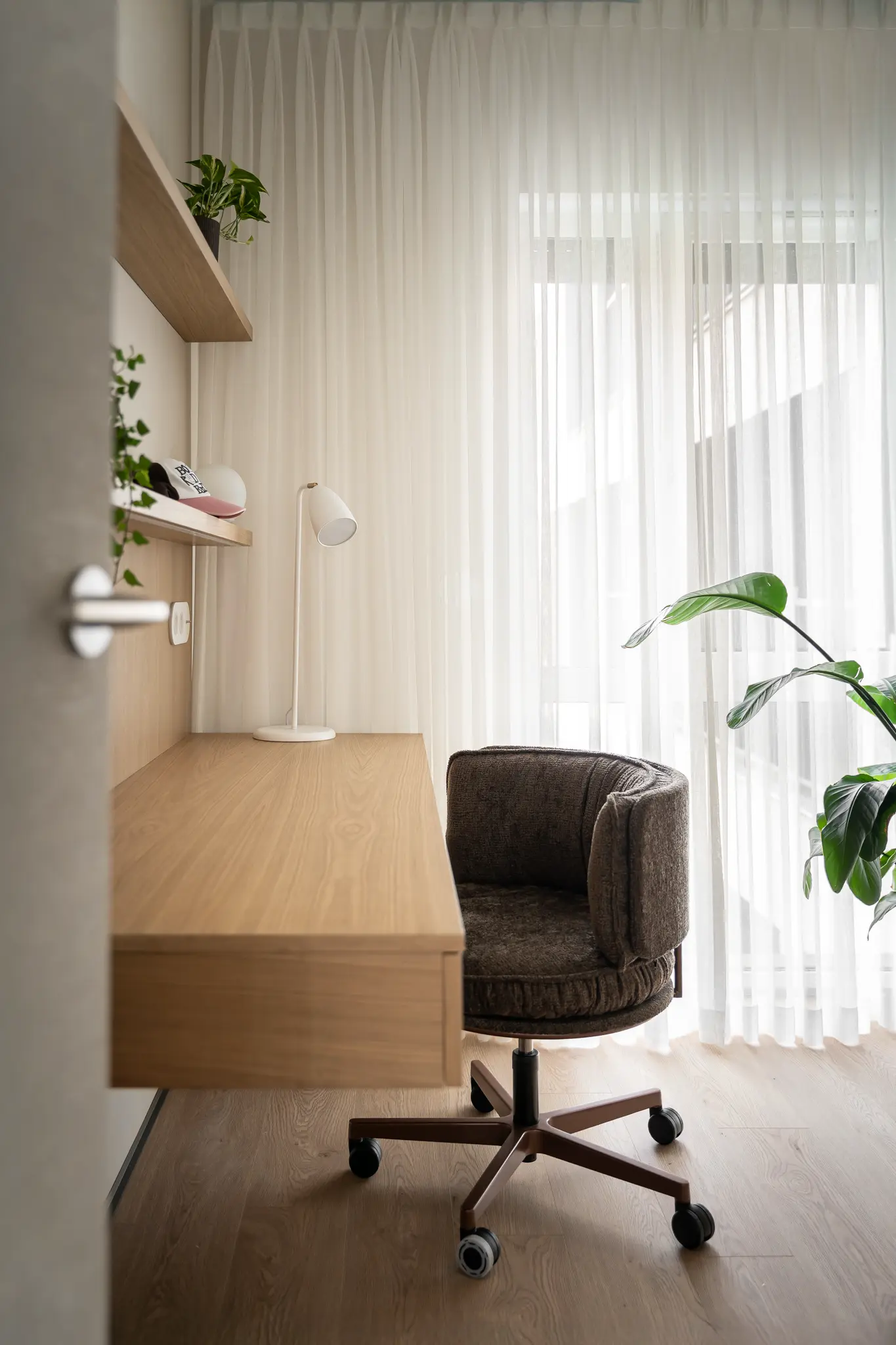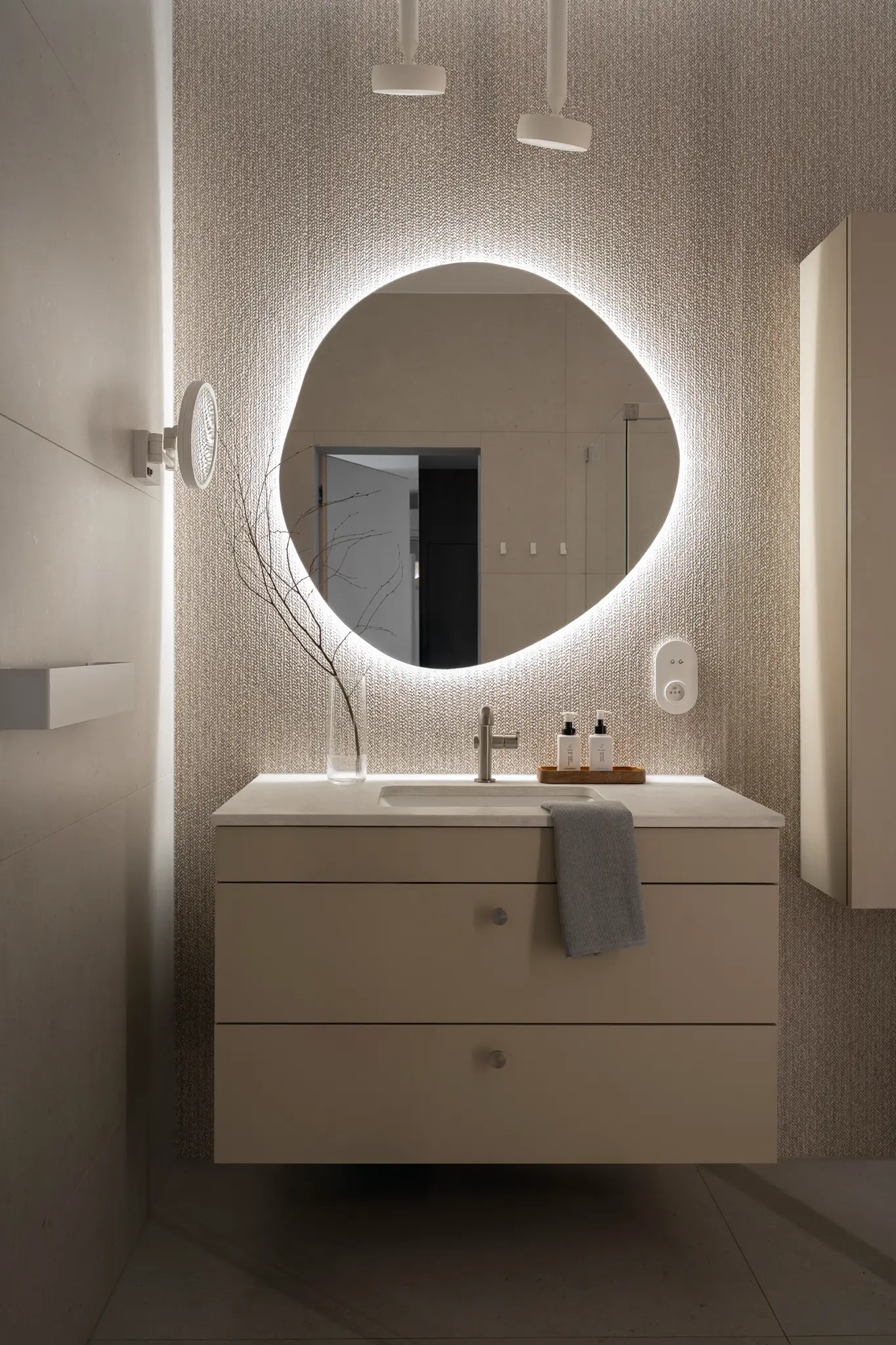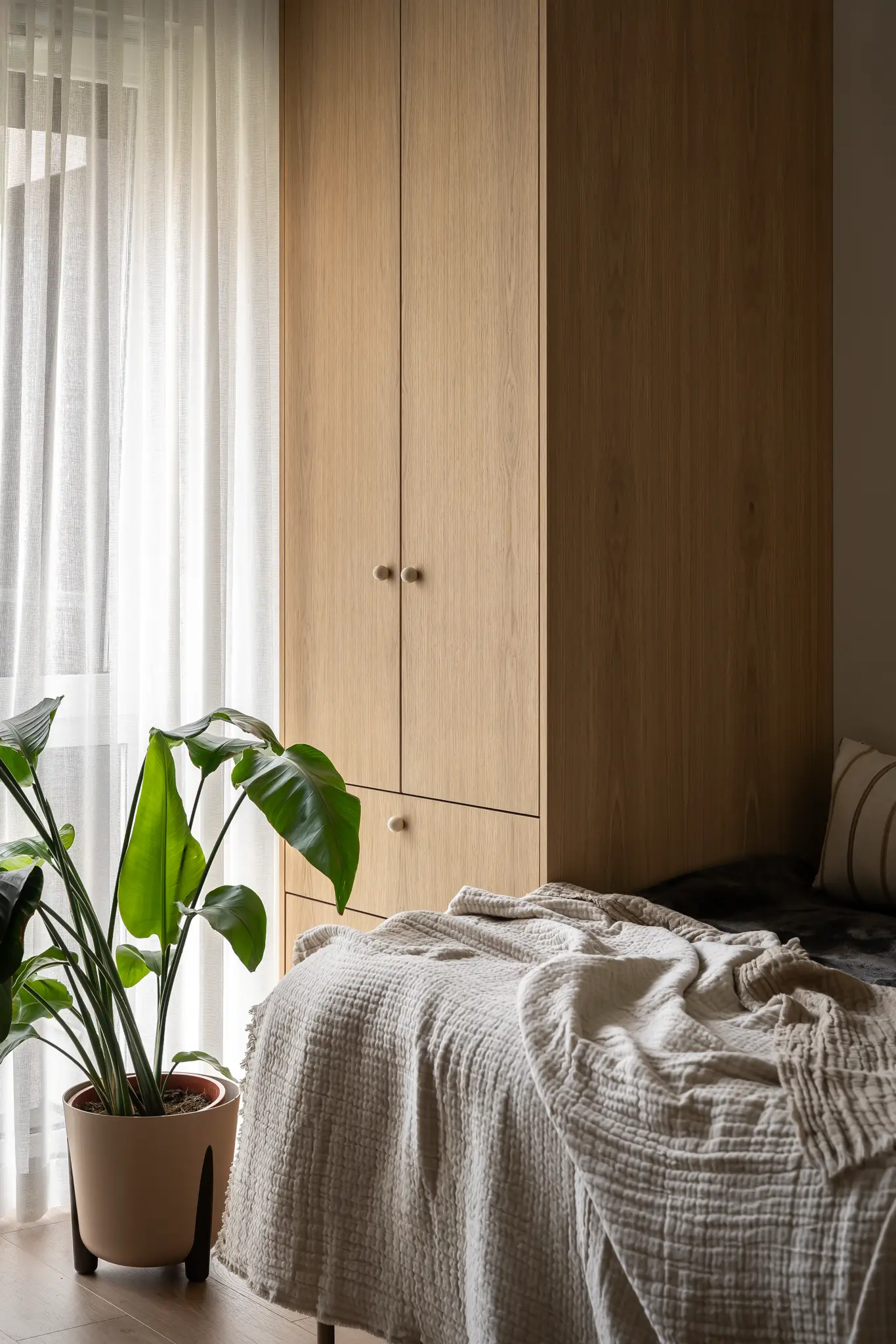 Zlokalizowane w zielonym sercu Bydgoszczy, tuż obok parku w Myślęcinku, to mieszkanie miało stać się dla jego właścicieli oazą spokoju i harmonii. Ich marzeniem było wnętrze, do którego wraca się po dniu pracy, by odnaleźć komfort i wyciszenie. Naszym zadaniem było przełożenie tego marzenia na język form, faktur i kolorów. Głównym bohaterem projektu uczyniliśmy drewno w starannie dobranym, pastelowym odcieniu, które w dialogu z neutralnym beżem stworzyło spójną i ciepłą bazę. Ściany otuliliśmy francuską tapetą o lnianej strukturze, dodając wnętrzu klasy i przytulności. W tak przygotowanej przestrzeni swoje miejsce znalazły ikony światowego wzornictwa, jak fotel Togo od Ligne Roset, oraz designerskie oświetlenie od polskich marek, które nadają całości indywidualny charakter. Sercem domu jest salon z kuchnią, subtelnie oddzielony od wejścia ażurową, drewnianą ścianką. Minimalistyczna zabudowa z dębowego forniru i blat z konglomeratu kwarcytowego podkreślają elegancję projektu. Ta estetyczna kontynuacja przenika do łazienki i sypialni, gdzie naturalne materiały i stonowana kolorystyka tworzą spójną opowieść o komforcie i prostocie.