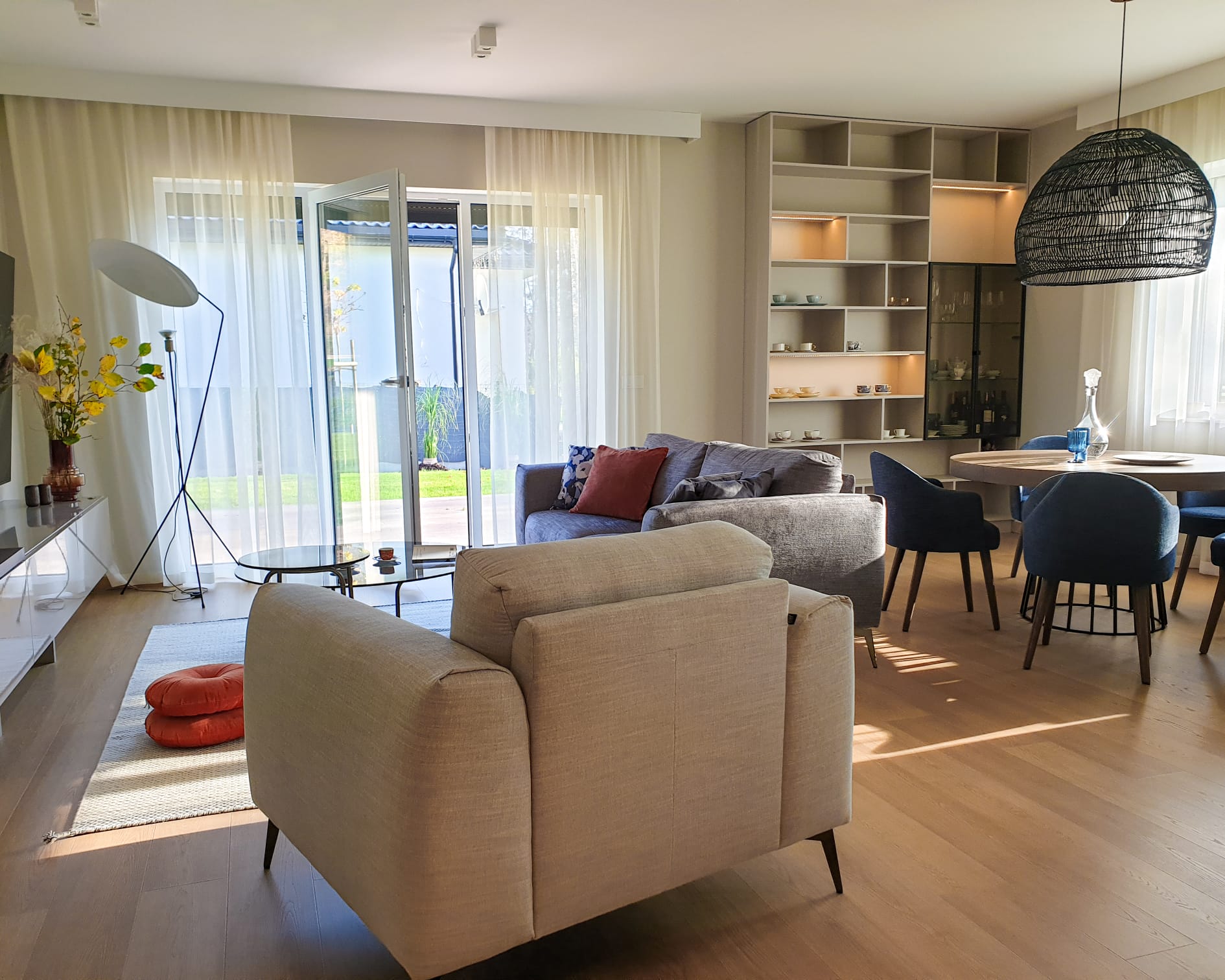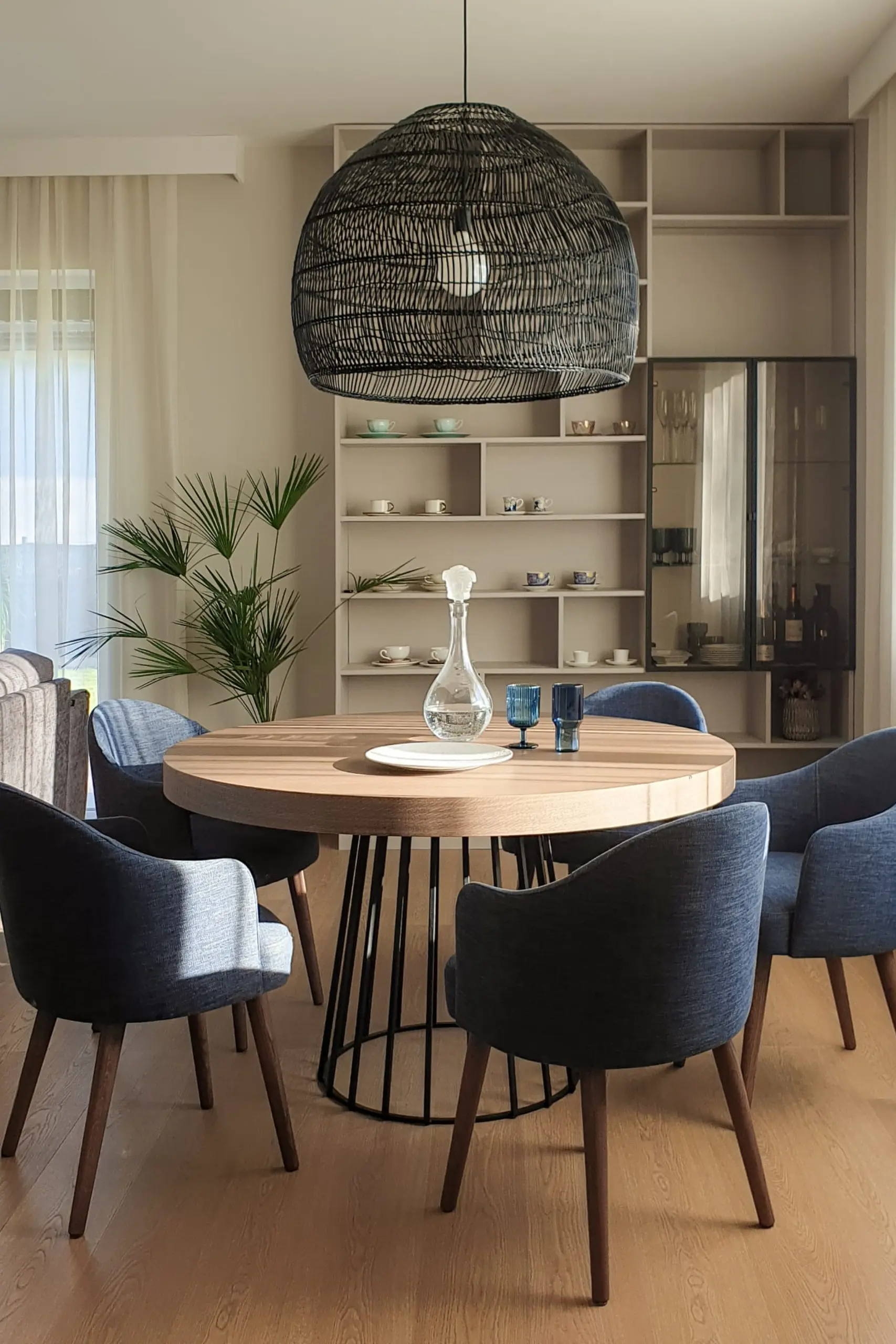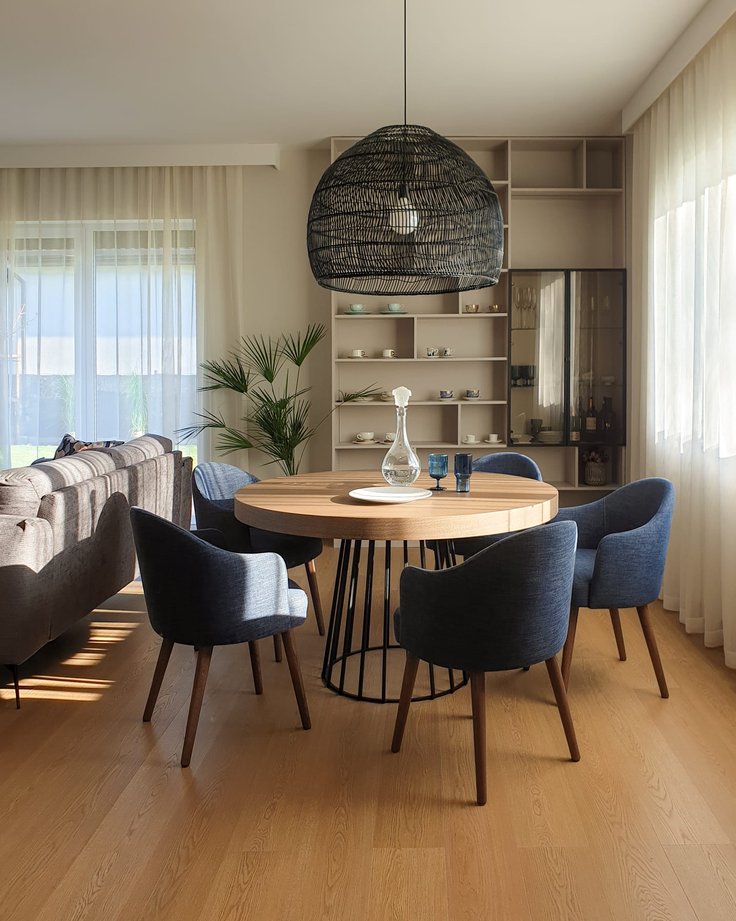 Położenie domu w sąsiedztwie lasu niedaleko Torunia stało się punktem wyjścia do całego projektu. Chcieliśmy, by wnętrze odzwierciedlało otoczenie i wprowadzało do środka naturalną harmonię. Właścicielka pragnęła przestrzeni kojącej, otwartej, ale jednocześnie intymnej. W palecie kolorystycznej dominują beże, ciepłe szarości i różne odcienie niebieskiego. Naturalne materiały – drewno, len, wełna – podkreślają związek domu z otaczającą go przyrodą. Układ funkcjonalny sprzyja otwartości, ale pozwala też na stworzenie prywatnych stref do odpoczynku. Efekt to wnętrze, które oddycha razem z naturą. Z okien rozciąga się widok na drzewa, a każdy element wystroju zdaje się współgrać z rytmem otoczenia.