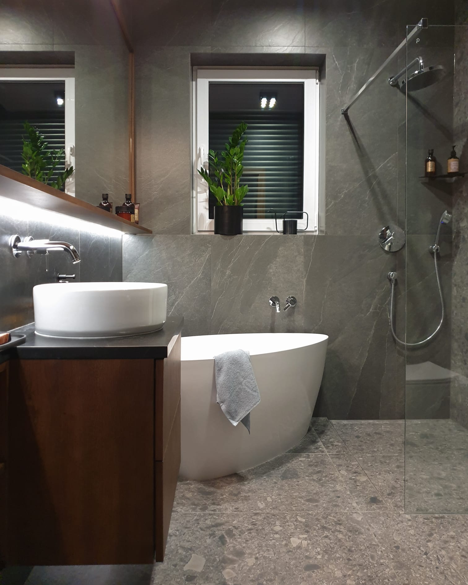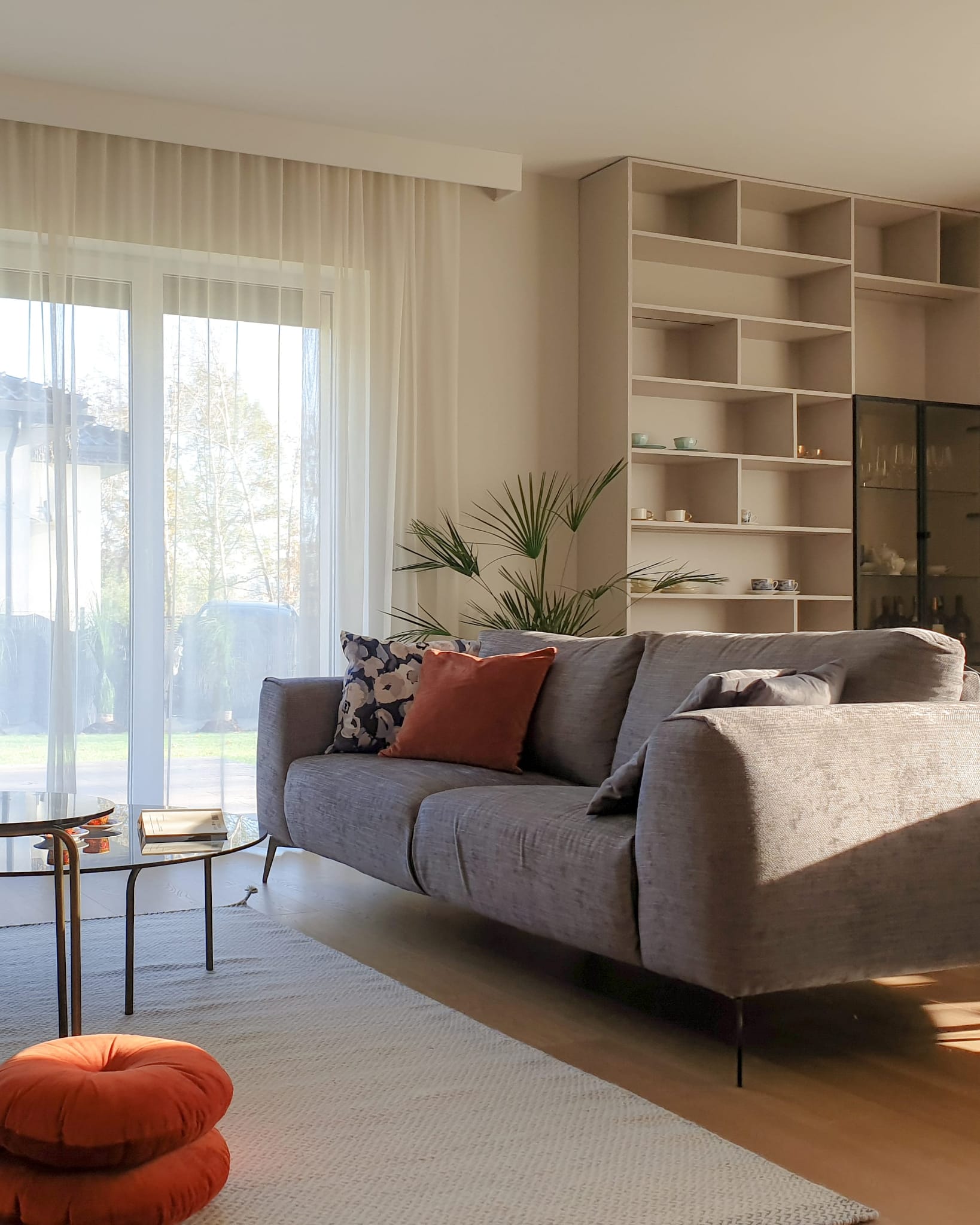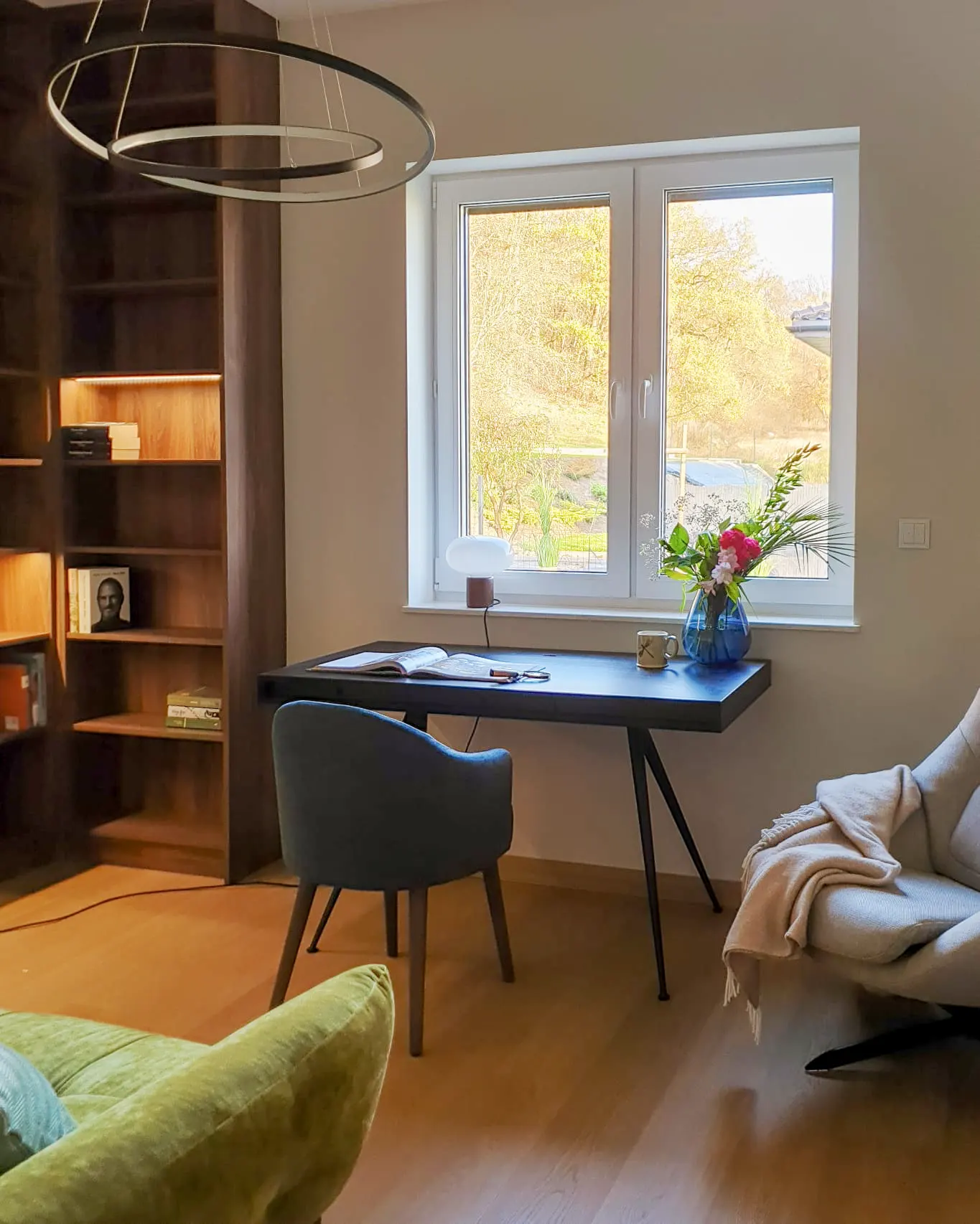 Położenie domu w sąsiedztwie lasu niedaleko Torunia stało się punktem wyjścia do całego projektu. Chcieliśmy, by wnętrze odzwierciedlało otoczenie i wprowadzało do środka naturalną harmonię. Właścicielka pragnęła przestrzeni kojącej, otwartej, ale jednocześnie intymnej. W palecie kolorystycznej dominują beże, ciepłe szarości i różne odcienie niebieskiego. Naturalne materiały – drewno, len, wełna – podkreślają związek domu z otaczającą go przyrodą. Układ funkcjonalny sprzyja otwartości, ale pozwala też na stworzenie prywatnych stref do odpoczynku. Efekt to wnętrze, które oddycha razem z naturą. Z okien rozciąga się widok na drzewa, a każdy element wystroju zdaje się współgrać z rytmem otoczenia.
