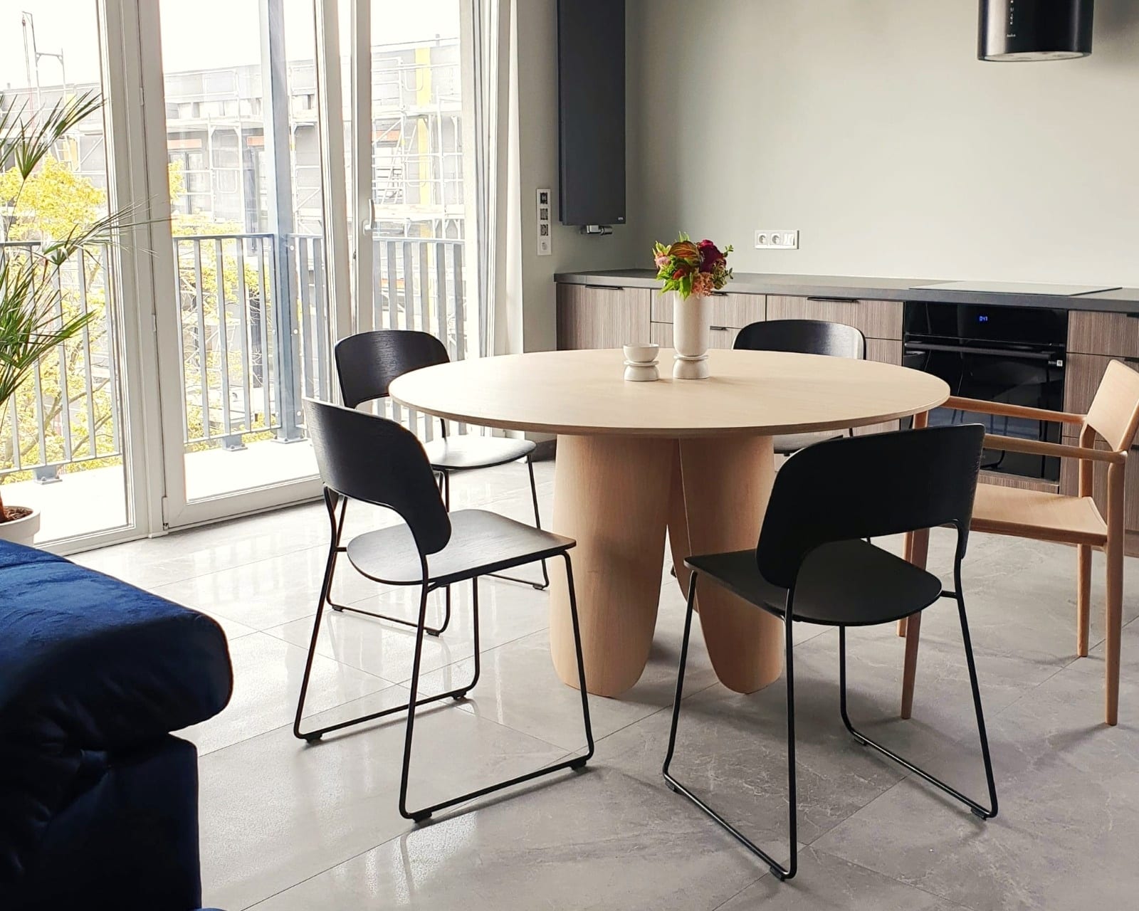 Wybór padł na kultowe lampy, designerskie meble i subtelne dodatki o wyrazistych formach. Każdy detal – od uchwytów po oprawy oświetleniowe – został dobrany z myślą o proporcjach i spójności. Przestrzeń zyskała lekkość dzięki jasnym ścianom i dużym przeszkleniom, które wpuszczają naturalne światło.