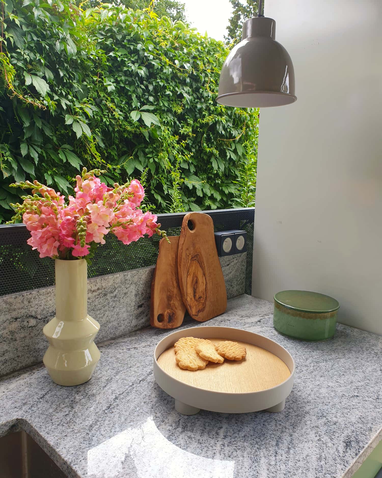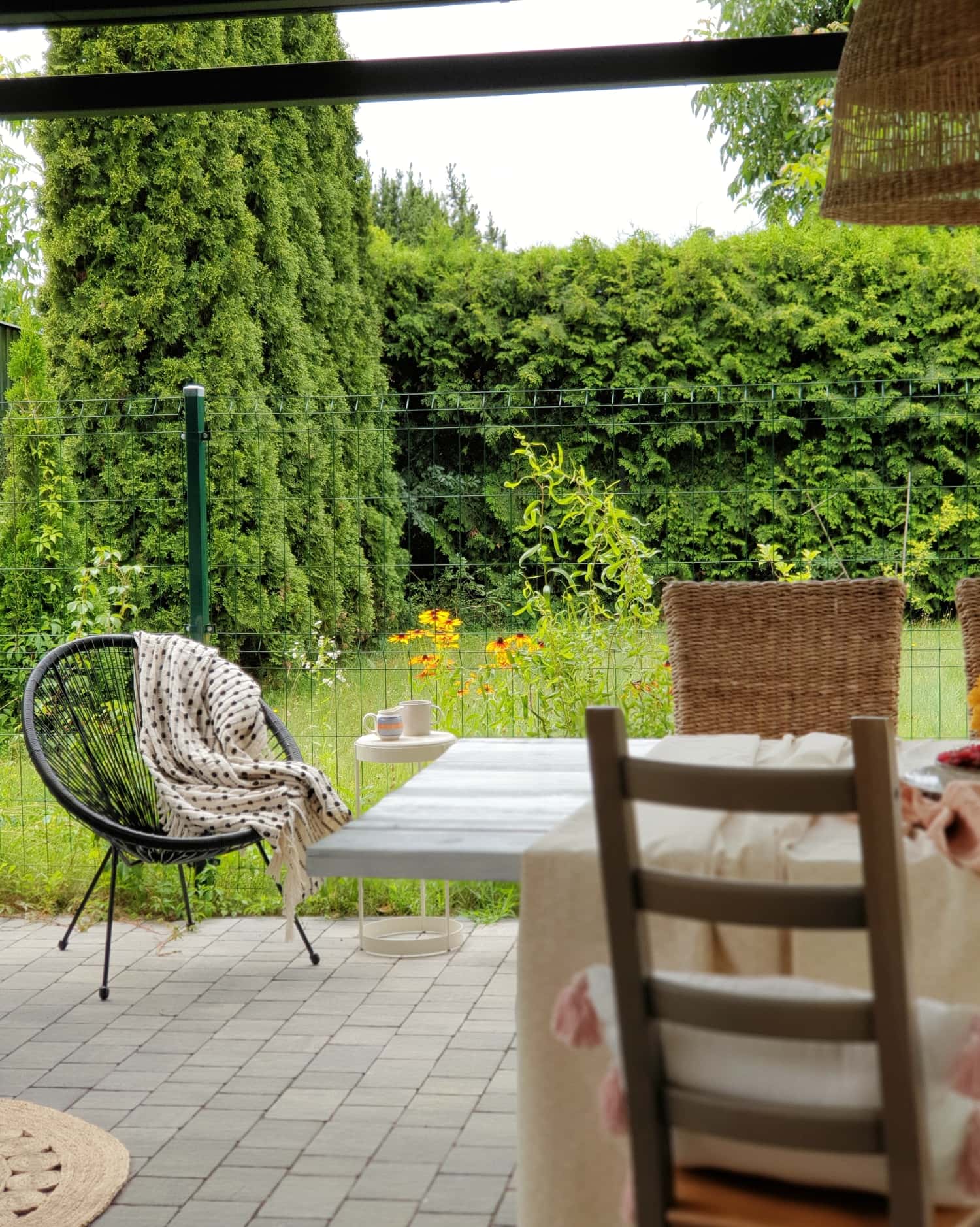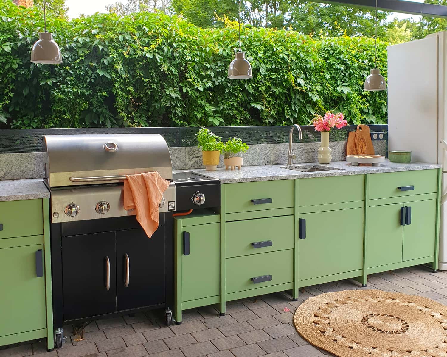 Zabudowa w odcieniu zieleni została dobrana tak, by harmonizować z otoczeniem. Blaty z szarego granitu dodają elegancji i trwałości. Przestrzeń została zaplanowana tak, aby była praktyczna – z altaną, roletami elektrycznymi i dużym, ponad 3-metrowym stołem sprzyjającym wspólnym posiłkom.